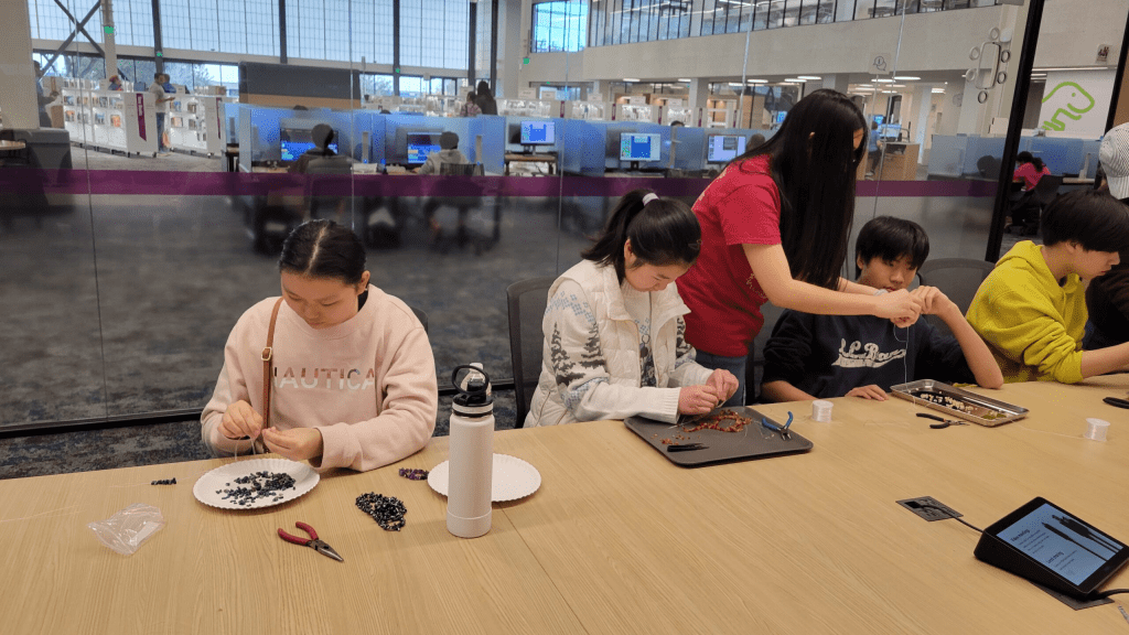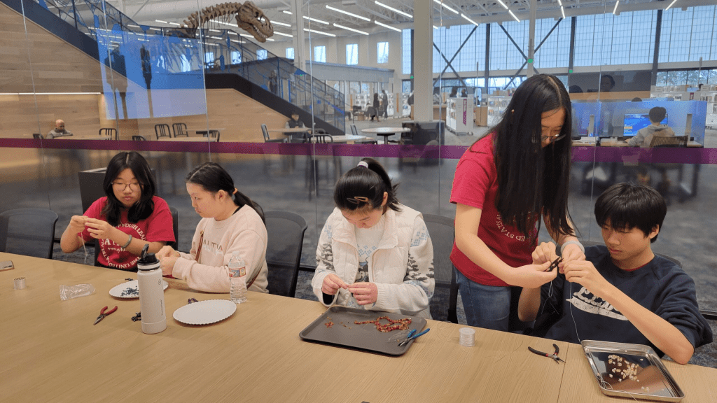 On January 6th, we went to Frisco Library to make gemstone bracelets. We were making bracelets to prepare for the TMMTD flea market to fundraise for the kids with cancer at the Plano Children’s Medical Center. We have several new members that are joining us recently. Vicky Zhao and Jasmin Zhao have taught new members to learn how to make bracelets so they can help supply us for our present and future fundraiser.