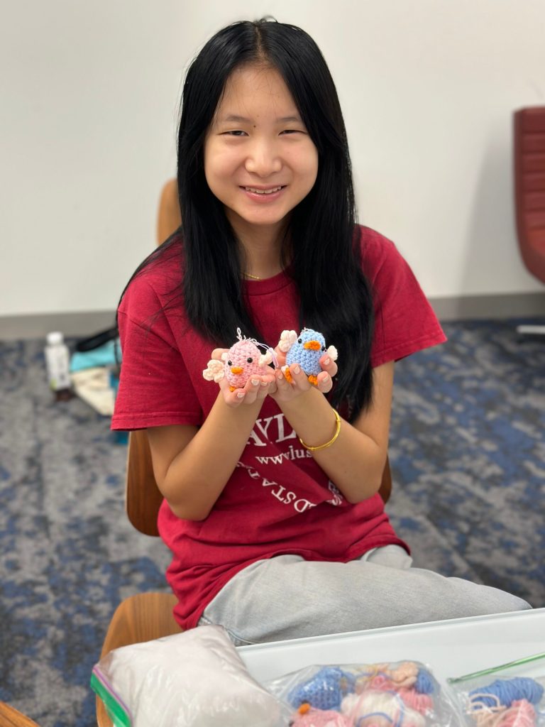 On September 8th, 2024, 5 volunteers from the Frisco & Plano AYLUS branch gathered together from 10:00 AM to 12:00 PM to crochet small bird amigurumi keychains. During this event, each of our volunteers were able to get started on crocheting keychains, and some were able to complete an entire keychain and more (pictures below). A total of 7 birds were made in this workshop! These crochet keychains are to be gifted000 to the cancer patients at children’s hospitals, along with hats our volunteers made, or to be sold in the flea market to raise funds for donations. Wonderful job from our volunteers, and we hope to see them at next week’s meeting as well!