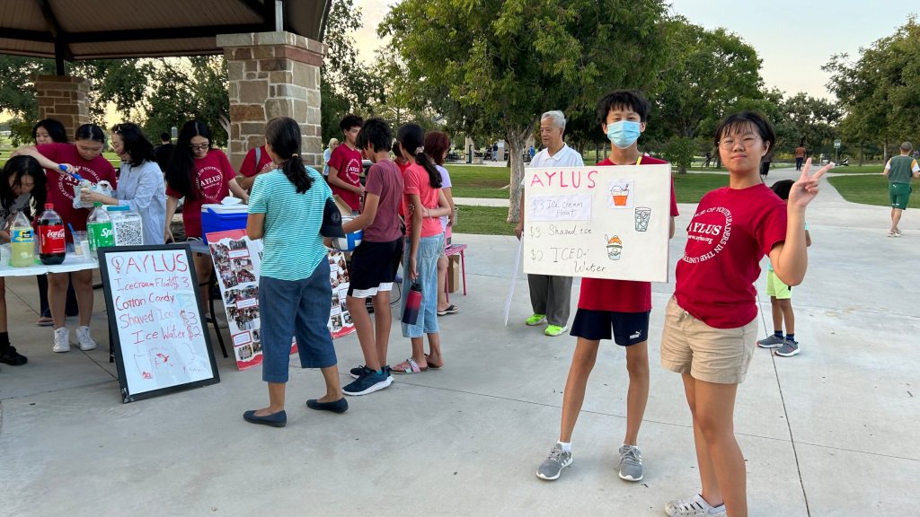 On September 21st, volunteers of AYLUS continued to fundraise at Russell Creek park for the Loops for Love project. This time, because of the low sales of boba tea, we introduced a new item to the shop — Ice cream floats. Ice cream floats are soda with ice cream on top, and turned out to be quite a popular item (especially with the root beer soda). The soda flavors as a whole included Lemonade, Coca Cola, Root Beer, Fanta, and Sprite, as well as Vanilla ice cream to create the float. Starting at 6:30 PM, similarly to other visits, we assigned everyone different roles, and everything went smoothly. After 9 pm, we closed shop and went home (the tables, signs, food/drink materials were divided between two volunteers for the next time).