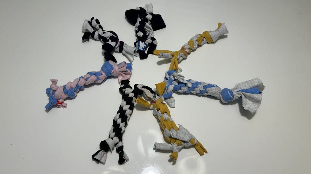 On September 22nd, we made pet toys using old clothes for the cats and dogs at the animal shelter at one of the volunteers’ residences. This is the first time for our group to make pet toys. Our mentor taught us the process of making the toy, by teaching them how to cut old clothes into strips and braid them to the toys. While it was challenging at first, we finished 7 toys at the end. After finishing, we cleaned up thoroughly and left no trash behind. Everyone in the group enjoyed the experience and looks forward to making more pet toys in the future for the well-being of the shelter animals.