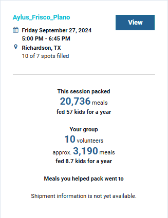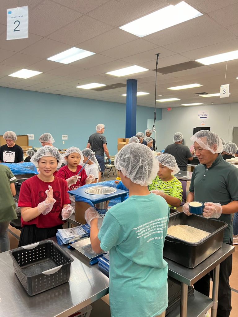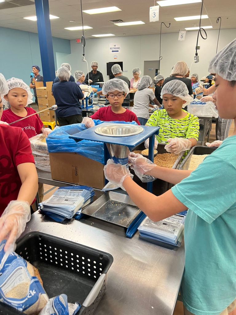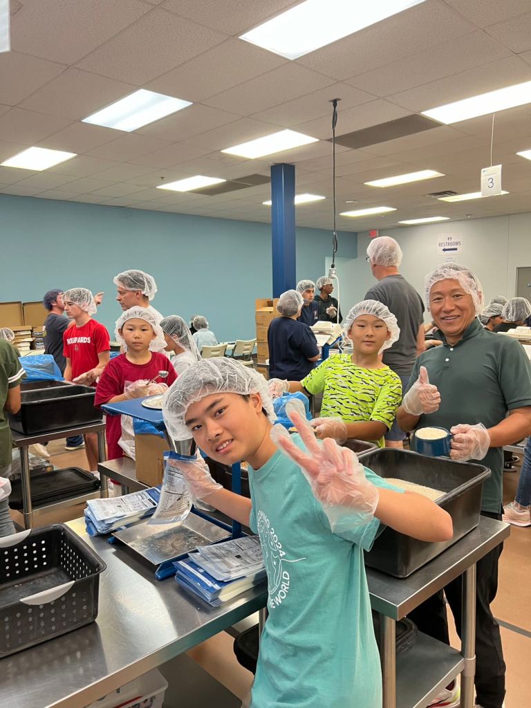 On Sep 27 six members of AYLUS and five parents participated in a Feed My Starving Children (FMSC) packing session. FMSC already had everything set up .We started off in a big group with tons of other volunteers each part of their own organization. Then a staff member went over some requirements and rules before we got split into group and sent to the packing stations.