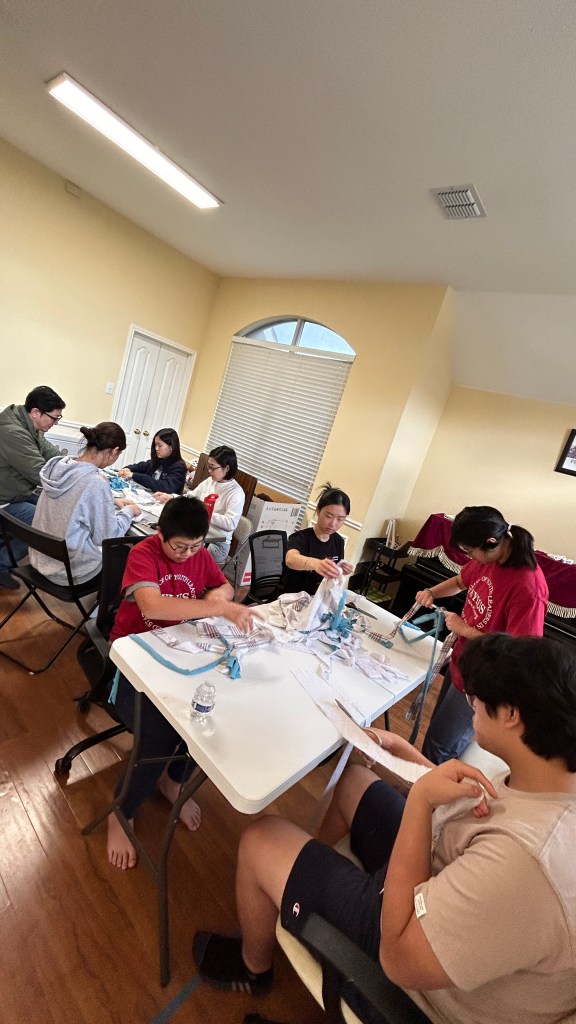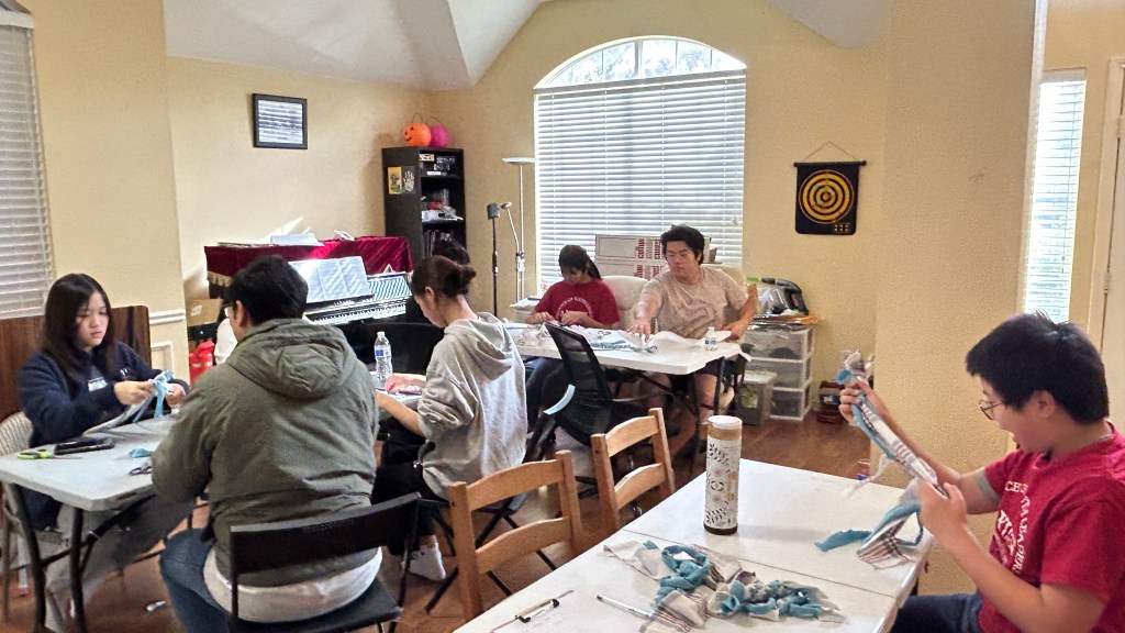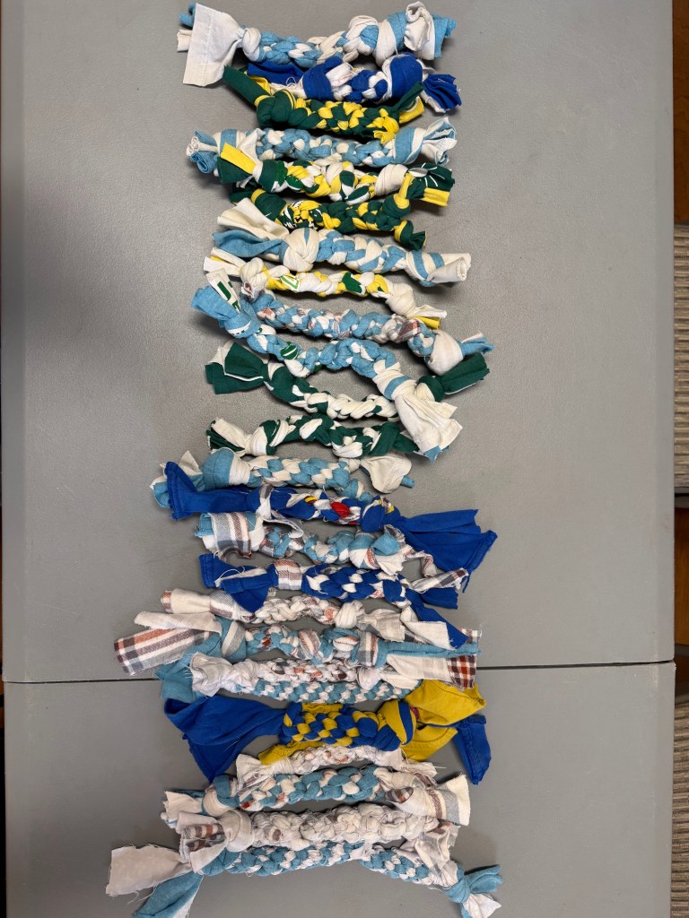 On December 15th, 11 volunteers (both youth and adults) came together in one of the volunteer’s household to craft handmade pet toys for the local Plano animal shelter. Four of the volunteers were newcomers, and were taught how to craft the toys by learning, working with, and asking for help from other long-time volunteers. As the process may be tedious, music was played throughout as well to keep the volunteers entertained. From 1:30 pm to 3:30 pm, we spent 2 hours cutting the fabric from volunteer-donated shirts and tying them, and made a total of 25 pet toys. This is a promising number—as the last time we had made pet toys, all of them got donated!